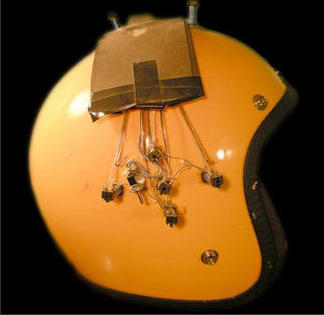 Persinger modified a snowmobile helmet by mounting solenoids on it that were placed over the