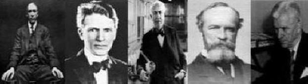 (Left to Right: Harry Price, Hereward Carrington, Thomas Edison, William James and J.B. Rhine)
